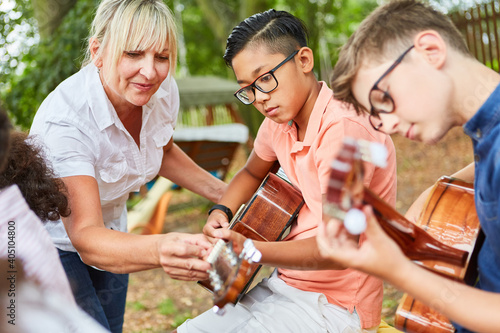 Lehrer und Kinder im Gitarrenkurs im Sommercamp