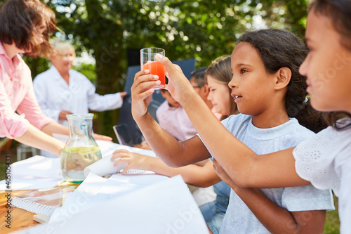 Mädchen hält Glas bei Experiment im Ferienkurs