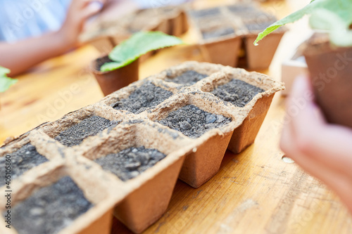 Group of children with seedlings learn botany