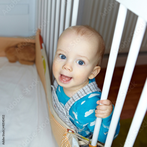 Glückliche Mutter und Junge am Babybett