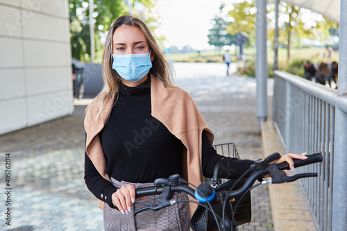 Frau mit Fahrrad und Mundschutz in der Innenstadt