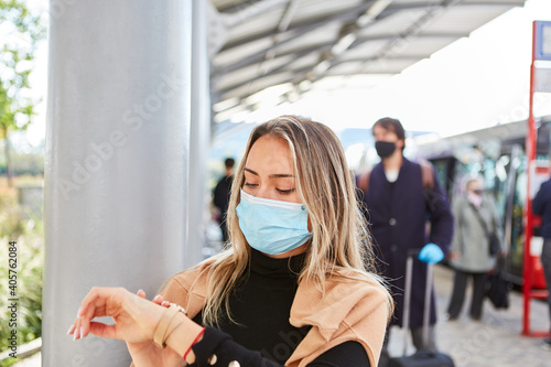 Pendlerin mit Mundschutz wegen Covid-19 wartet auf Bus