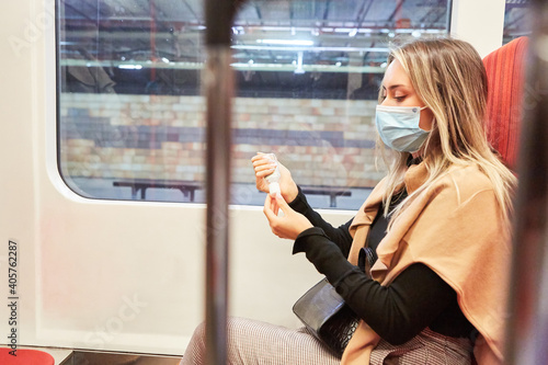 Pendlerin mit Maske in der Bahn beim Hände desinfizieren