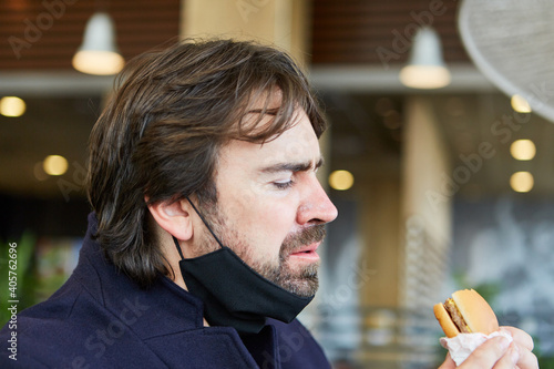 Hungriger Mann beim Burger essen mit Maske am Kinn