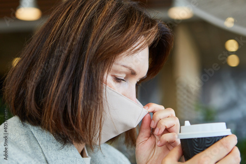 Frau als Gast mit Kaffeebecher und Mundschutz am Kinn