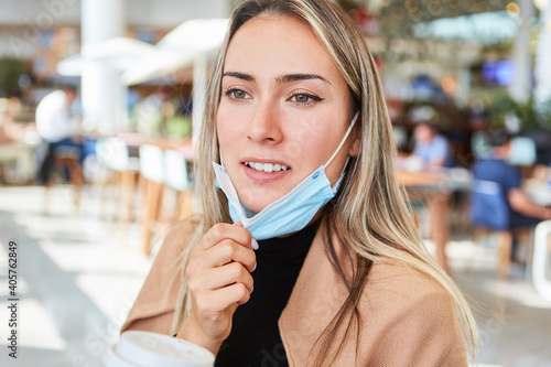 Genervte Frau mit Mundschutz am Kinn mit Coffee to Go