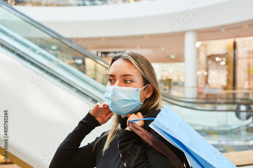 Kundin mit Mundschutz und Einkaufstaschen im Shoppingcenter