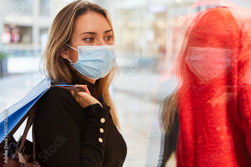 Kundin beim Shopping mit Mundschutz vor einem Schaufenster