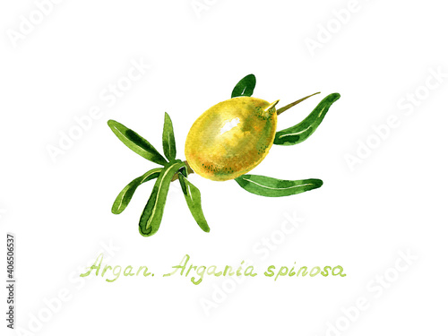 Watercolor. Famous argan plant from Morocco. Design advertising shops, cosmetic skin hair care oil products, beauty salon healthy menu, invitation card flyer poster cover, booklet packaging textile #406506537