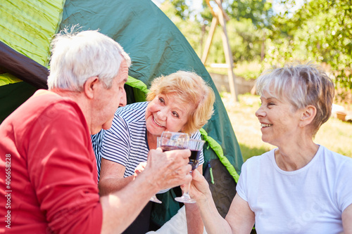 Senioren trinken Wein zusammen vor dem Zelt