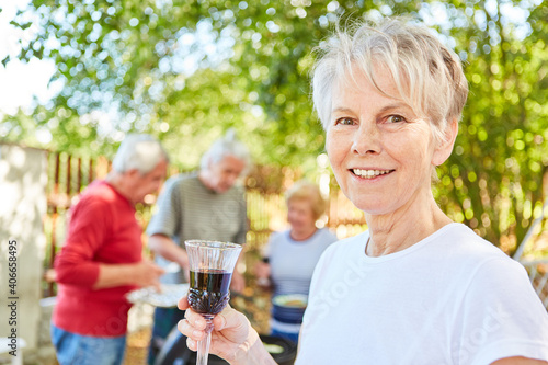 Senioren stoßen an mit einem Glas Weißwein und feiern zusammen Geburtstag