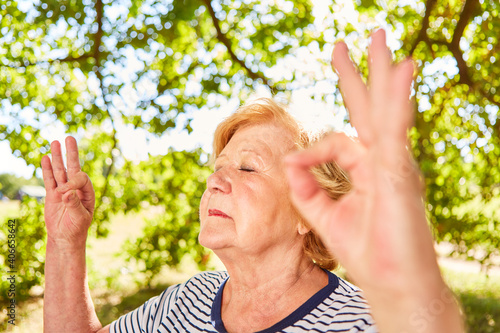 Seniorin macht Atemübung und Meditation im Sommer
