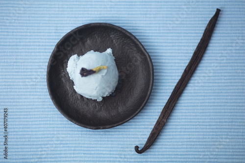Fresh scoop of vanilla ice cream with vanilla pods and blossom