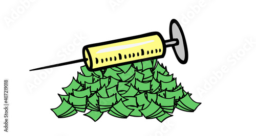 Spritze schiebt Schubkarre voll Geld als Impfung Konzept