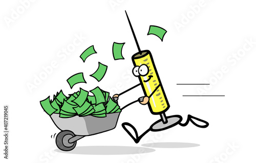Spritze schiebt Schubkarre voll Geld als Impfung Konzept