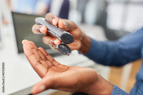 Hände von Business Mann beim desinfizieren