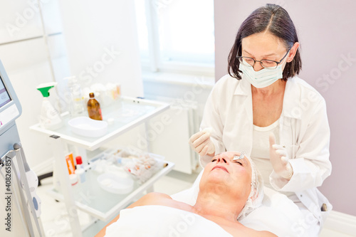 Hautärztin bei Vorbereitung einer Augenlidstraffung
