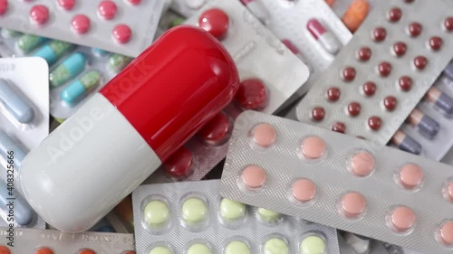 Seamless closeup loop shot of big pill on top of blisters of medication
