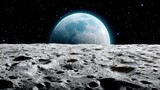 Moon surface and blue planet rising beyond cratered horizon in deep space scene