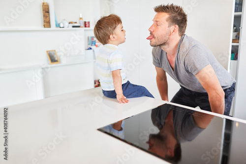 Glückliche Eltern heben Sohn hoch als Familie zu Hause