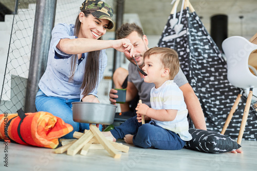 Glückliche Eltern heben Sohn hoch als Familie zu Hause