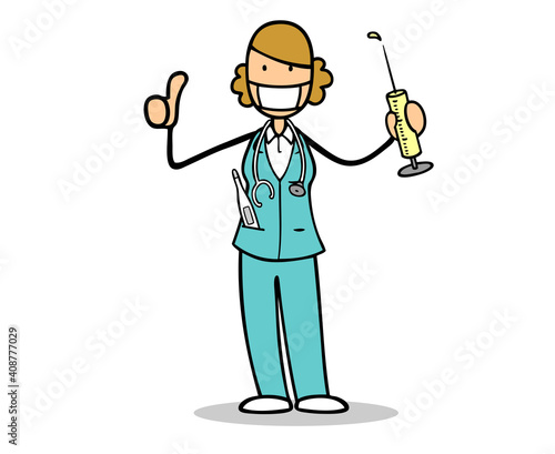 Lächelnde Cartoon Pflegekraft mit Covid-19 Spritze mit Impfstoff