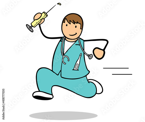 Cartoon Pfleger rennt mit Spritze zum Pflegefall
