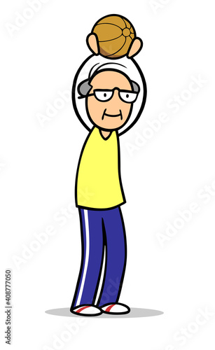 Cartoon Frau macht Seniorenturnen mit Medizinball