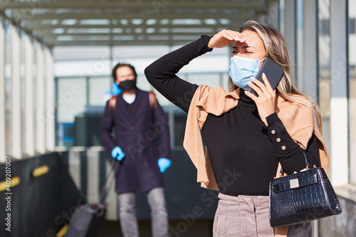 Passantin mit Mundschutz telefoniert mit dem Smartphone