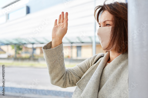 Passantin mit Mundschutz winkt zur Begrüßung