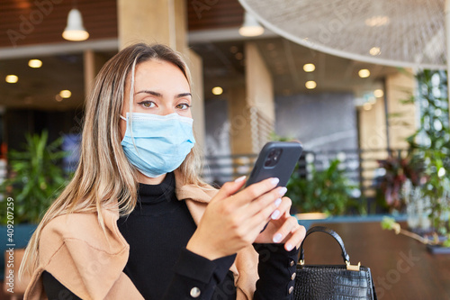 Woman with face mask sits with smartphone in a restaurant