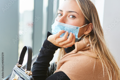 Frau mit Mundschutz als Prävention gegen Coronavirus