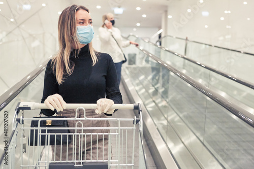Kundin mit Mundschutz und Handschuhen mit Einkaufswagen