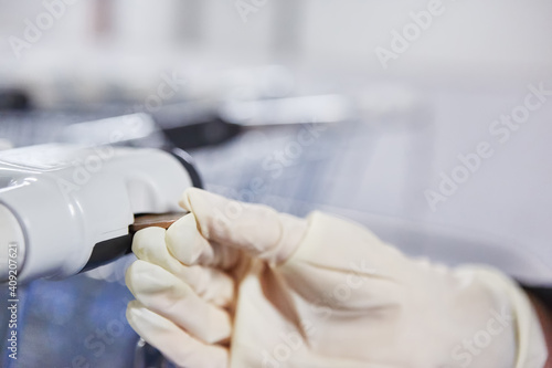 Kundin mit Mundschutz und Handschuhen mit Einkaufswagen