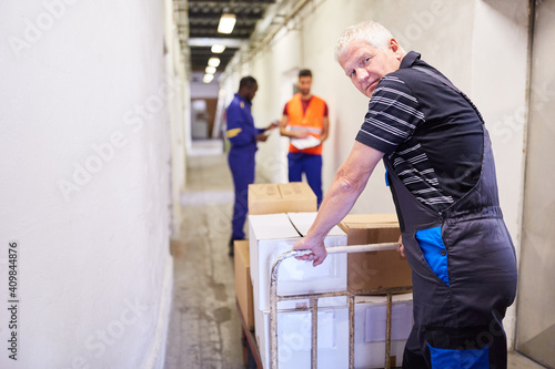 Arbeiter schiebt Pakete auf dem Schubwagen