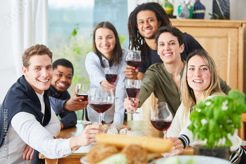 Freunde mit Glas Rotwein am Tisch warten auf Überraschung