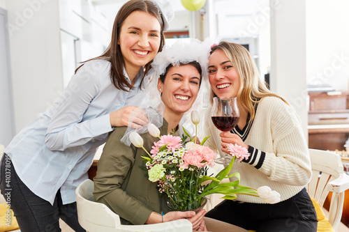 Lachende Freundinnen feiern mit Braut bei Junggesellinnenabschied
