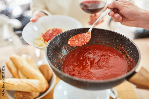Tomato sauce is served with pasta at the table for meal