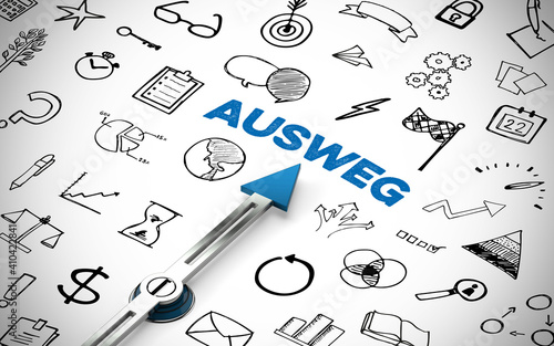 Kompass Pfeil zeigt auf Schriftzug Ausweg zwischen Icons