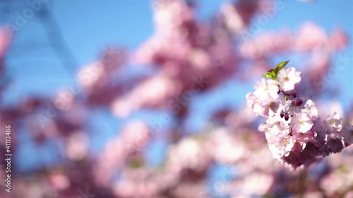 Pink cherry blossoms against blue sky with falling petals, spring floral scene