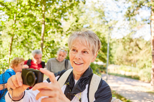 Lächelnde Frau mit Freunden beim Nordic Walking