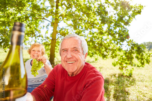 Glückliches Paar Senioren trinken Wein am Geburtstag