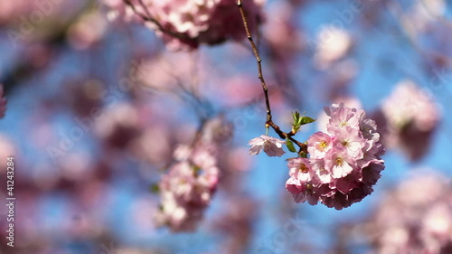Cherry Blossom Branch With Pink Flowers Against Blue Sky Background In Springtime With Sunlight For Seasonal Designs And Spring Concepts