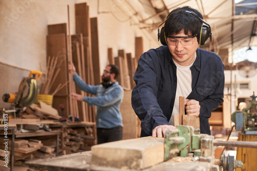 Handwerker Lehrling beim Holz hobeln in Werkstatt