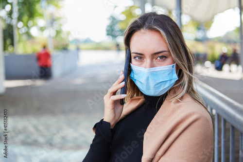 Passantin mit Mundschutz telefoniert mit dem Smartphone