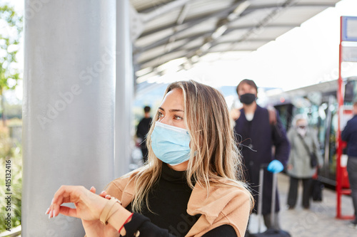 Pendlerin mit Mundschutz wegen Covid-19 wartet auf Bus