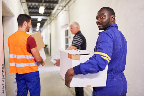 Arbeiter trägt mit Kollegen Kartons zum Lager