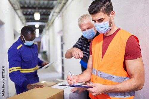 Arbeiter mit Mundschutz kontrollieren Lieferung