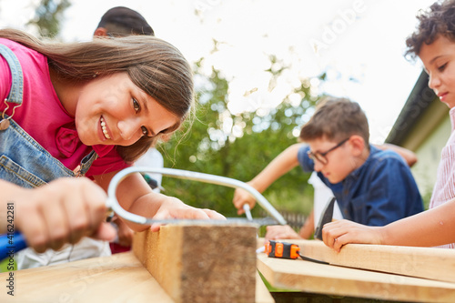 Junge mit Wasserwaage hat Spaß beim werken mit Holz