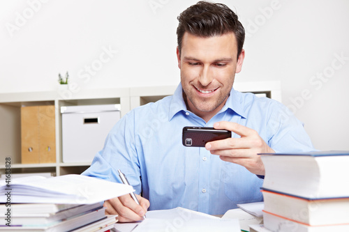 Mann schaut beim Lernen auf Smartphone